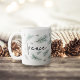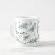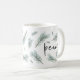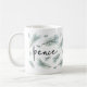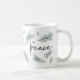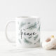 Le design moderne et festif de la tasse de vacances présente "peace" en lettrage manuscrit chic, entouré d'illustrations de chandelles de pin aquarelle en vert d'épinette.