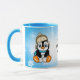 Un mignon manchot dessiné à la main avec des boules de neige et des flocons arrière - plan. Tasse à café personnalisée.