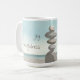 Commencez votre matinée avec cette tasse à café de 15 onces avec un paysage de plage avec des cairns au premier plan avec les mots personnalisables, "Joie, Paix, Mindfulness et sérénité.