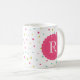 Mug monogramme coloré et moderne avec motif pois rose chaud, bleu et jaune foncé avec étiquette à bord de pétoncle rose chaud. Cette tasse personnalisée sera parfaite comme un cadeau.