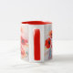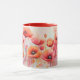 Une tasse avec une belle aquarelle. Un champ de fleurs rouges avec de belles gouttes d'eau et des éclaboussures.