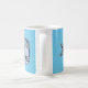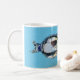 tasse en céramique cool, avec illustration graphique d'un grand requin blanc coincé dans une bouteille d'eau, contre un arrière - plan à vague bleue. Customisez d'ajouter votre propre texte.