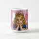 Tasse élégante représentant une fille aux cheveux dorés avec une couronne de joaillerie dans une chambre royale rose, symbolisant l'émerveillement de l'enfance, l'élégance et l'imagination.