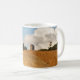 Cette tasse de photographie d'art offre un magnifique paysage agricole rural. C'est l'automne et la récolte des céréales est en cours. Au premier plan, les lignes jaunes et brunes sont partiellement coupées. En surplomb de la colline se trouve la ferme avec ses silos. Des cumulus blancs purs et un ciel bleu complètent la composition.