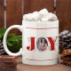 Joie rouge avec baies de Noël photo tasse à café. Il montre le mot "JOY" avec des baies rouges et de la verdure tandis que au lieu de la lettre "O" il y a votre photo.