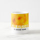 Rose jaune floral moderne BLESSED Dans le nom de Jésus Mug de café chrétien, avec le mot BLESSED dans la typographie BLANCHE et DANS le nom de JÉSUS en gris. Tout le texte est PERSONNALISABLE, vous pouvez donc créer votre propre texte et ajouter votre référence et/ou nom d'Ecriture favoris. Cette tasse chrétienne inspirante ferait un grand cadeau pour Noël, Anniversaire, Fête des Mères, Fête des pères, etc. D'autres versions similaires (y compris les versions simples et les versions parties scintillant) sont disponibles.
