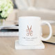 Élégante tasse de logo pour salons de cheveux ou coiffeurs présente une paire de ciseaux en feuille d'or rose ornée de fleurs. Personnalisez-vous avec deux lignes de texte personnalisé en dessous du lettrage gris classique, parfait pour votre nom de salon.