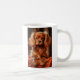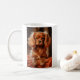 Portrait d'un Ruby Cavalier King Charles Spaniel. Le chien est assis sur un tissu doux et orange avec ses pattes bien placées devant lui. Ses grands yeux sombres regardent directement le spectateur, lui donnant un sentiment de chaleur et d'affection. La fourrure du chien est méticuleusement détaillée, montrant sa texture douce et ses vagues fluides. Un cadeau parfait pour les amoureux de Cavalier.