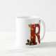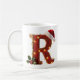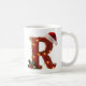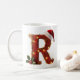 This letter 'R' is special because it combines rustic, warm wood texture with the cozy charm of traditional holiday decorations. The chunky red wooden letter, draped with glowing string lights, and topped with a Santa hat and holly creates a warm, inviting visual. It is perfect for holiday announcements, rustic farmhouse decor, or festive graphic design.