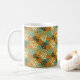 Cette tasse a un design moderne du milieu du siècle d'un adaptateur d'enregistrement qui se superpose partout en tan, blanc cassé, marron, orange, turquoise, bleu et vert.