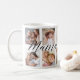 Envoyez un beau cadeau personnalisé à votre grand-mère (maman) qu'elle chérira pour toujours. Petits-enfants personnalisées spéciales photo collage tasse pour afficher vos propres photos et souvenirs de famille spéciaux. Notre design comprend une simple grille de montage photo de 10 avec "Mama" conçu dans un style de script noir écrit à la main. Chaque photo est encadrée et centrée dans une simple bordure dorée. Customisez avec les noms des petits-enfants.