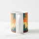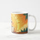 Dessin géant d'un soleil personnifié dégustant une tasse de café à l'aube. Dans un décor tropical chaleureux avec des feuilles de palmiers, l'image capture l'essence cosy et joyeuse d'un début de matinée parfait.