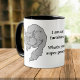 Cette drôle de tasse apportera un sourire. L'image est celle d'un chat de maison de dessin animé gris et allongé avec les yeux jaunes et un sourire satisfait. Le texte en noir dit : "Je suis du mobilier de chat. Quelle est votre super-puissance ?" Vos amis amateurs de chat comprendront totalement ! L'image du chat est répétée deux fois sur la tasse, avec le texte au milieu.