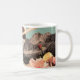 In the foreground, soft blooming flowers in warm peach and golden hues bring intimacy and life to the scene. Their delicate forms contrast beautifully with the monumental mountains and the vast, silent planet overhead. The result is a composition that feels expansive yet grounded, blending the emotional pull of nature with the wonder of the cosmos.