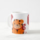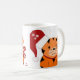 Le tigre le plus mignon se jetait pour les vacances dans un casquette rouge et blanc avec des petits flocons de neige blancs. Un arc rouge autour du cou. Ajoutez un dicton si vous le souhaitez.