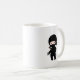Un mignon dessin animé en ninja habillé en noir tient une étoile qui lance. On peut voir le katana d'épée japonais traditionnel attaché par-dessus son épaule.