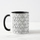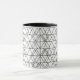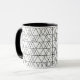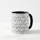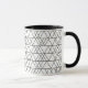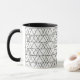 Cette tasse a un design moderne du milieu du siècle de triangles blancs courant horizontalement fait de lignes noires.