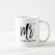 Notre tasse à café moderne en brosse noire "Mr" est un cadeau parfait à donner au marié ou pour vous-même. Le design comprend le "Mr" dans une police de script de style brosse moderne. Personnaliser avec nom de famille et date du mariage. De l'autre côté de la tasse à café a le même design.