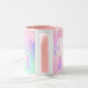 Un arrière - plan holographique branché aux couleurs pastel unicorne et arc-en-ciel rose, violet, or rose, vert menthe. Décoré avec des gouttes de parties scintillant en or rose, rose et violet et deux licornes. Personnalisez et ajoutez un nom, écrit avec un script de style à la main moderne. Lettres violettes.