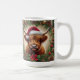 Une charmante vache des Highlands portant un chapeau de Santa au milieu d'un arrangement festif de cônes de pin, de saints et d'ornements. Parfait pour fêter la saison des Fêtes avec une touche de charme rustique.