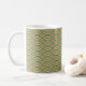 Cette tasse a un design Boho des vagues vertes et orange sur un champ vert clair.