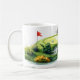Commencez votre journée avec une touche de parcours de golf. Cette élégante tasse à café avec un green de putting de golf présente une scène peinte à l'aquarelle avec un vert lisse, un drapeau rouge classique et une atmosphère sereine de country club.