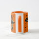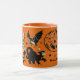 Treat yourself to a pumpkin spice quaff or your favorite hot beverage with this personalized coffee mug. The name appears on both sides of the mug and is surrounded by vintage style Halloween graphics including a witch, some cats, a bat, a jack-o-lantern pumpkin and an owl. The black and cream graphics are set against an orange background.