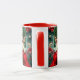 A sweet Christmas coffee mugs that can be personalized with a cute elf cartoon and a festive background.