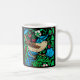 Mug dans un motif de tuiles de l'Art Nouveau William Morris, numériquement rehaussée et colorée, représentant un oiseau dans le beige et marron doux, avec des fleurs bleues vives et ceruleennes, des feuilles verts et des fraises sauvages, contre un arrière - plan noir