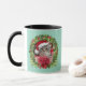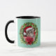 Un Tabby portant un chapeau de Père Noël regarde depuis un bas de Noël.