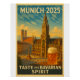Das Reiseplakat "München 2025 - Probieren Sie den bayerischen Geist" zeigt den belebten Marienplatz mit dem großen Neuen Rathaus in gotischem Detail