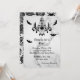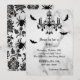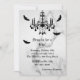 Ein schwarzer Kristallkronleuchter und unheimliche Fledermäuse auf klassischem Marmorboden schmücken das moderne Halloween-Party Invitation. Der Rücken ist mit einem extravaganten Spinnendamasken geschmückt.