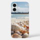 Lass deine Gedanken zu treiben, wenn du über den Strand nachdenkst und Muscheln sammelt. Viele Muscheln im Sand entlang der Küste. Knuspriges blaues Wasser und eine Baumreihe auf der anderen Seite des Sees.