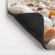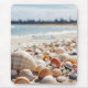 Lass deine Gedanken zu treiben, wenn du über den Strand nachdenkst und Muscheln sammelt. Viele Muscheln im Sand entlang der Küste. Knuspriges blaues Wasser und eine Baumreihe auf der anderen Seite des Sees.