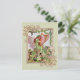 Vintage Kunst mit Märchenmalerei auf eine wunderschöne, mit Kleeblatten bedeckte Fee und mit großen rosa Schmetterlingsflügeln, die eine goldene Harfe spielen, wie kleine Mädchen Feen und Kobobold-Fee mit grünen Mänteln und schwarzen Top-Hüten kreisförmig tanzen.