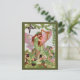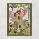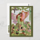 Vintage Kunst in Grün. Vintages Märchenbild mit einer wunderschönen Fee mit langen, rötlich-braunen, lockigen Haaren in einem langgrünen Kleid, bedeckt mit Kleeblatten, großen rosa Schmetterlingsflügeln, und in ihren Haaren spielt sie eine große goldene Harfe wie winzige Mädchenfeen und lekobarböne Feen mit grünen Coats und schwarzen Top-Hüten, die rund um die hübsche Fee spielen Musik. und bezaubernde Gartenfeiern mit Party und Tanz in einem Garten mit grünen Blätter und Nischen in Märchenland. Vintag Kunst in Grüntönen.