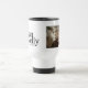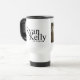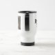 Reise-Tasse, die das "in der Zeit" Logo und ein Foto von Ryan in einer ledernen Jacke kennzeichnet