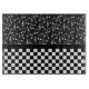 Fun Retro Look Schneide Board hat eine "50er Diner Jukebox-vibe mit dem oberen Panel der jumbled weißen musikalischen Noten auf schwarzem Hintergrund und ein Schwarz-Weiß-Schachbrett Muster unten Hälfte.