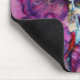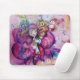 Farbenfrohe, skurrile, lustige, rosa Clownspiele mit einer ausdrucksvollen Eule und fröhlichen musikalischen Noten,Blume,Blätter in lebhaften Rot,Fuchsia,Violett,lila,blau,weiß, Aquarellmalerei von Bulgan Lumini (c)