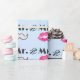 Umschlagpapier mit einem modernen Stil Paare Design für eine Hochzeit oder Jubiläum. Glamouröse, rosa Kissy Lippen und eine maskuline Retro-Look Schnurrbart-Illustration. Mit einem Text, der Mr. und Mrs. in einem Retro-Stil Schriftart sagt. Set auf türkisblauem Aquarell.
