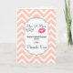 Ein Dankeschön, der eine Karte mit modernem Design begrüßt - glamouröse rosa Kissy Lippen und eine maskuline Retro-Look Schnurrbart-Illustration. Set auf einem pfirsichfarbenen Zickzack Hintergrund. Der Text sagt Mr. und Mrs. und Sie können mit Ihren Namen und Ihrem Hochzeitstermin personalisieren, die Innenseite hat eine Nachricht, die Sie verlassen können, wie es ist oder anpassen.
