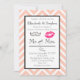 Eine moderne Hochzeitseinladung mit rosa Kissenlippen und einer Retro-mustache-Illustration. Set auf einem pfirsichfarbenen Zickzack Hintergrund. Personalisieren Sie Ihre Hochzeitsdetails.
