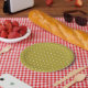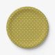 Pattern of white polka dots on a mustard yellow background. The dots are evenly spaced, creating a simple, vintage, playful aesthetic.