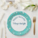 Editierbare Party-Teller mit Skript- und Serifenbriefen auf einem atomaren Retro-aquamarin-Weiß-Sternmuster auf einem veränderbaren, hellen aquamarinen Hintergrund.