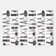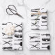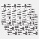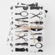 Friseursalon zum Thema Umhüllungspapier mit handelsüblichen Werkzeugen wie Kamm, Fön, Richter und Button