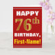 Dieses mögen einfache Geburtstag-themenorientierte Grußkarten-Ausrüstungsbeschreibungen ein warmer Geburtstagswunsch "GLÜCKLICHEN 76. GEBURTSTAG, Erst-Namen!" auf der Front im mutigen Text auf einem Rot färbte Hintergrund. Die Geburtstagszahl hat Imitat/nachgemachten Gold ähnlichen Farbtonauftritt. Der Name auf der Front kann besonders angefertigt werden. Die inneren Eigenschaften eine Geburtstagsmitteilung, die personalisiert sein kann. Eine Grußkarte so könnte eine Spaßweise sein, Geburtstagswünsche an jemand zu liefern, das ihren 6. Geburtstag siebzig feiert. [~Z0000276]