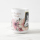 Blumengeschenk Tasse für Mama von einer Tochter. Fügen Sie ein Mutter- und Tochter-Foto hinzu und passen Sie den Text an. Die Beispielformulierung lautet "Mütter und Töchter sind für immer Freunde". Hübsche, rosa Blume schmücken eine weiße Tasse.