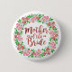 Dies ist ein hübscher Knopf für die Brautmutter bei Ihrer Hochzeit. Es hat einen Blumenkranz mit Aquarell, in rosa, weiß und grün gestrichen. Der elegante, kursive Text sagt "Mutter der Braut" in dunkelrosa Farbtönen.