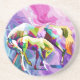 Brillante, geometrische Pferde stehen vor einem wirbelnden, psychedelischen Hintergrund. Lila, rosa und grüne Farbtöne harmonieren mit abstrakten Farbtönen. Digitale Kunstfotografie CS5