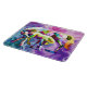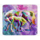 Brillante, geometrische Pferde stehen vor einem wirbelnden, psychedelischen Hintergrund. Lila, rosa und grüne Farbtöne harmonieren mit abstrakten Farbtönen. Digitale Kunstfotografie CS5